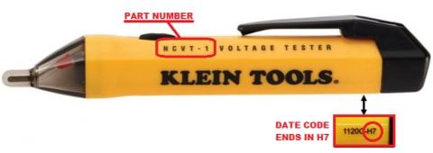 The recall covers 1.69 million Klein Tools Non-Contact Voltage Tester Model NCVT-1 sold in the US and another 67,800 sold in Canada. The product can be identified by its “part number” NCVT-1, located on the side, and a date code ending in “H7.”