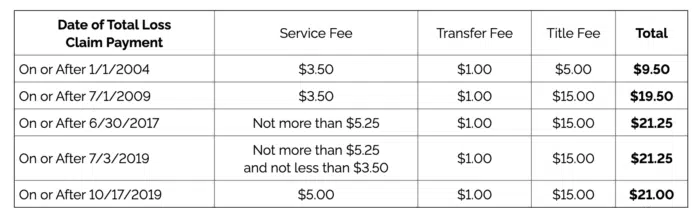 Sales tax payments will be made at Ohio’s average sales tax rate of 7.1%. Payments for service fees, transfer fees, and title fees will depend on the date of the original total loss payment and may range from $9.50 to $21. More information about how service fees, transfer fees and titles fees will be paid is available in the “Potential Award” section below.